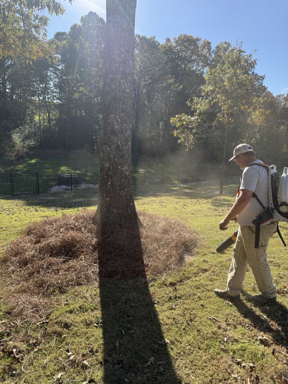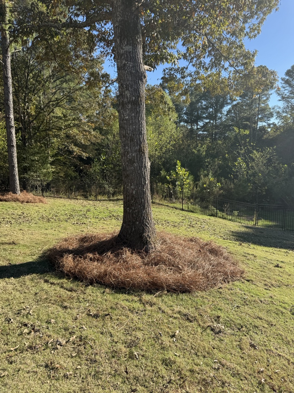 Once the area was cleared, we created a neat border around each tree to form a visually appealing shape and a clean separation from the surrounding lawn. This step enhances the appearance and also helps the pine straw stay neatly contained over time. With the groundwork complete, we began installing fresh long leaf pine straw, spreading it evenly and fluffing it to achieve a balanced, layered texture.