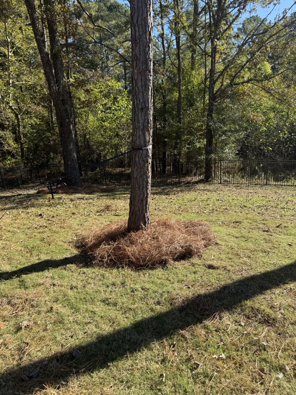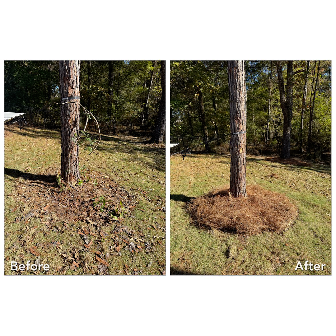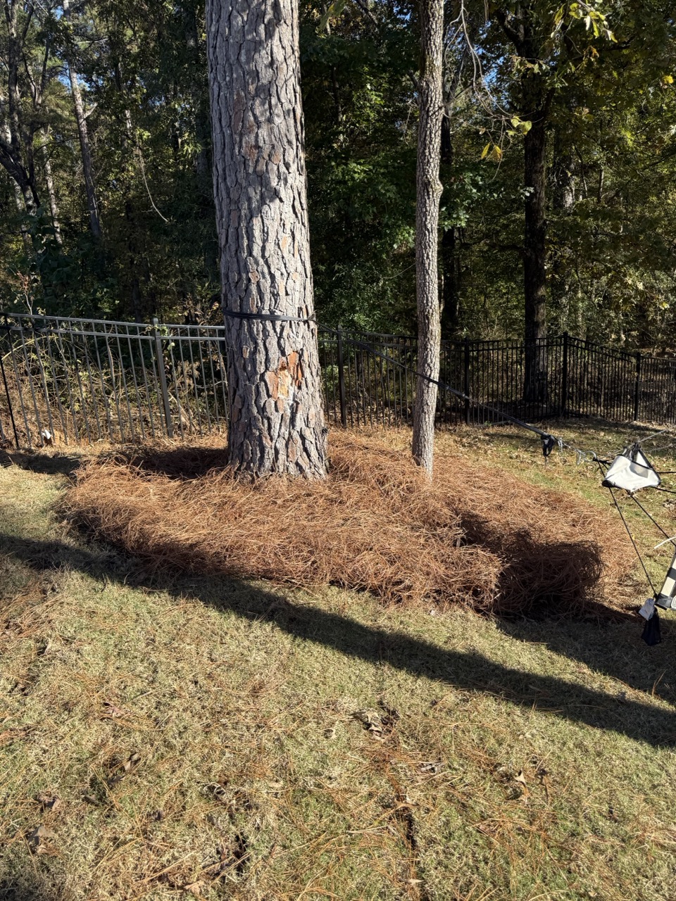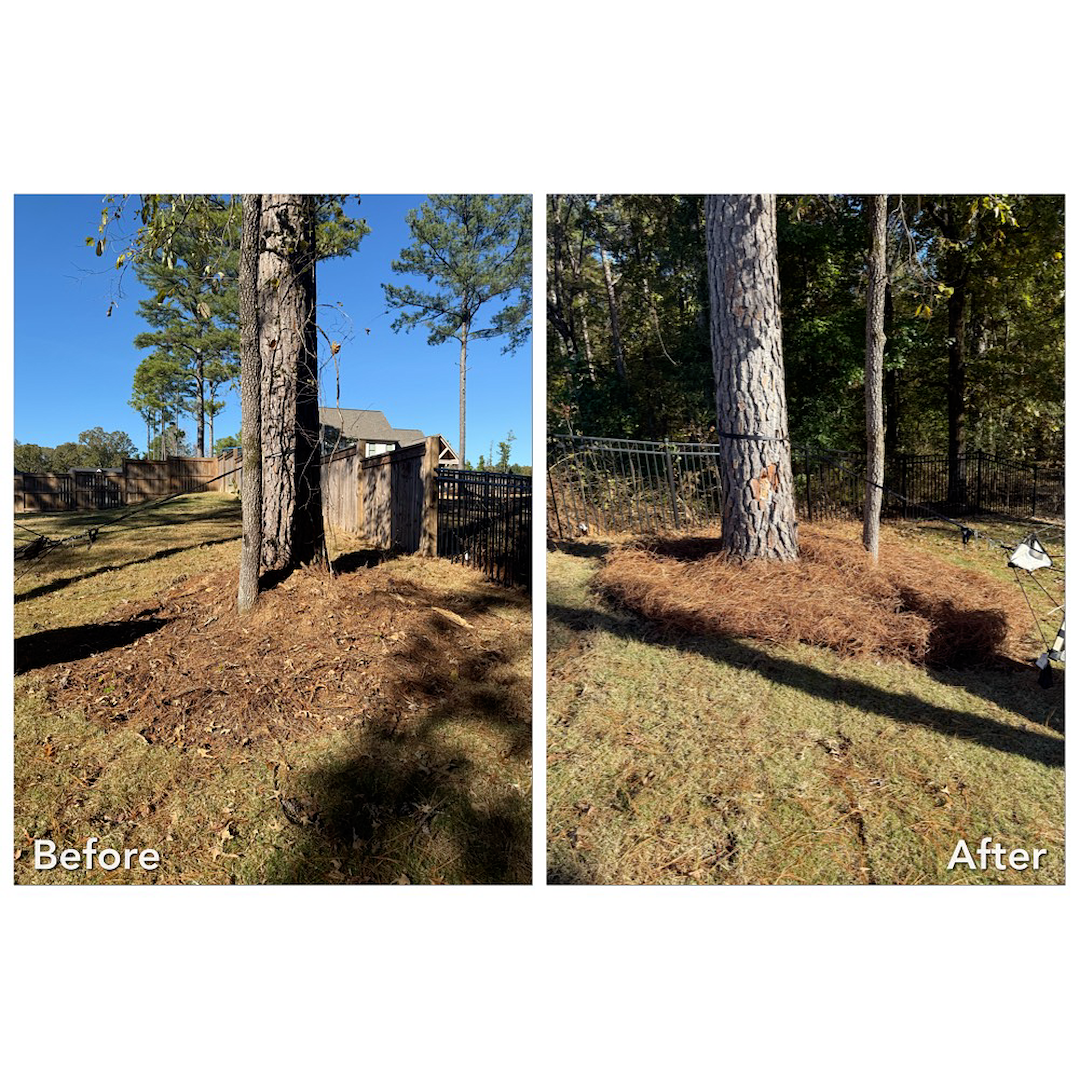 The difference was immediately visible. Before the installation, the space looked bare and unrefined, with exposed roots and uneven ground. Afterward, the pine straw beds added a rich, warm color that highlighted the trees and created a professional, landscaped appearance. The entire yard now looks cleaner, more polished, and more inviting. A small change made a big impact on the property’s overall presentation.