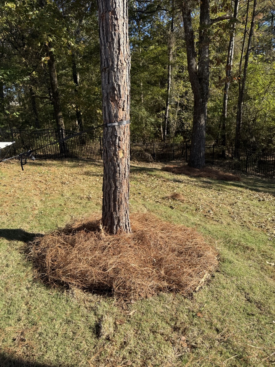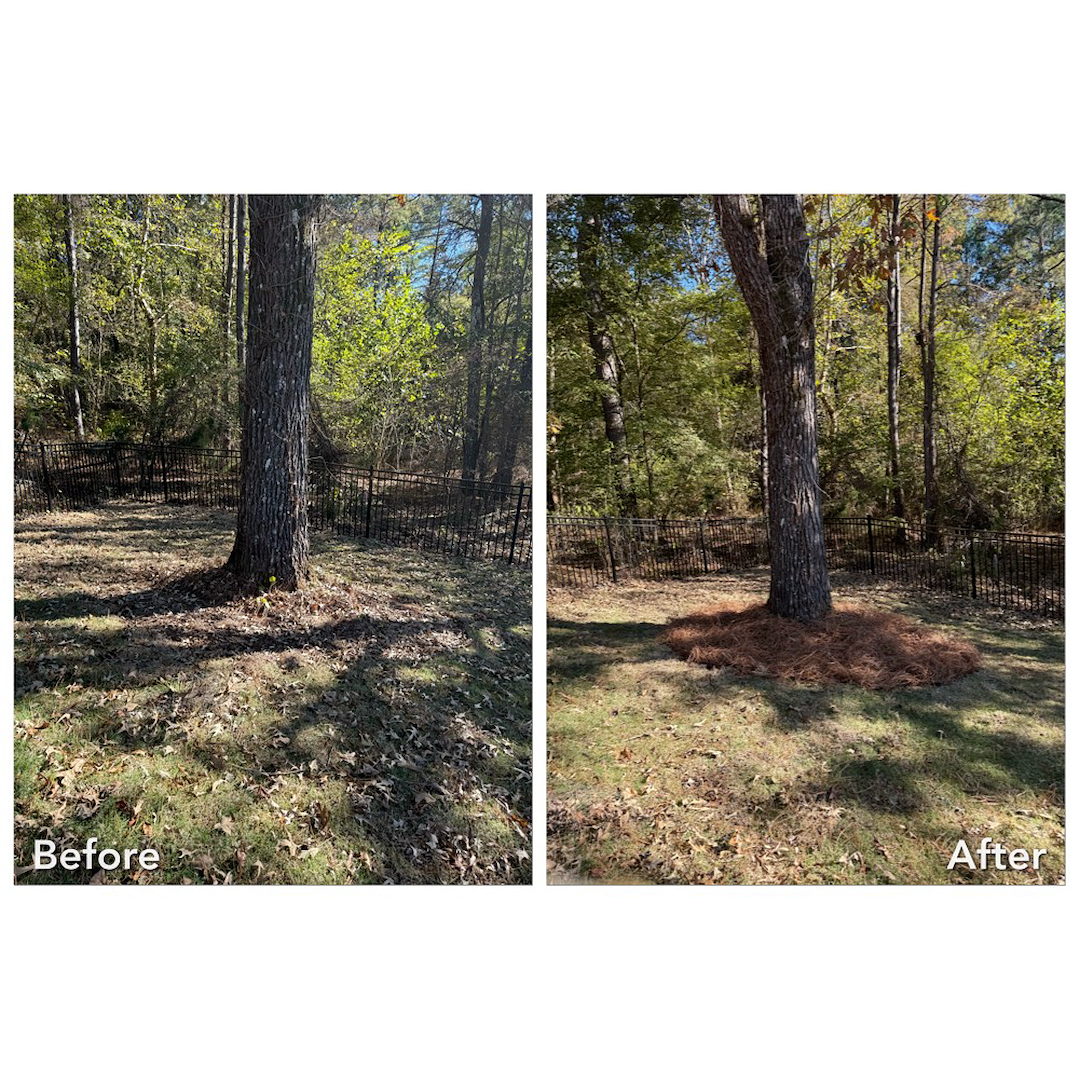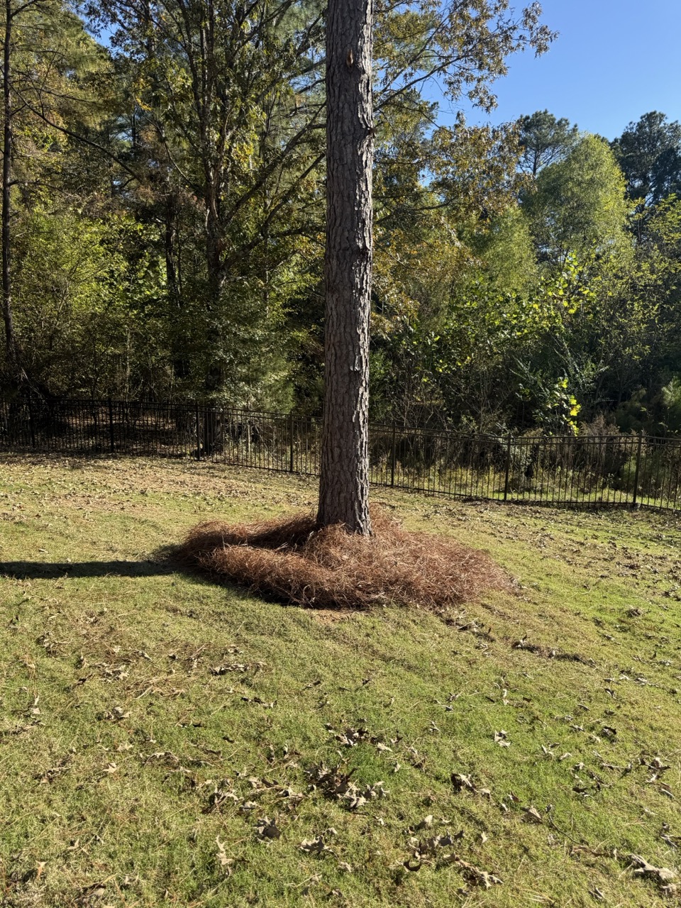 The difference was immediately visible. Before the installation, the space looked bare and unrefined, with exposed roots and uneven ground. Afterward, the pine straw beds added a rich, warm color that highlighted the trees and created a professional, landscaped appearance. The entire yard now looks cleaner, more polished, and more inviting. A small change made a big impact on the property’s overall presentation.