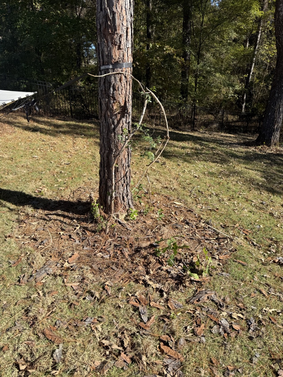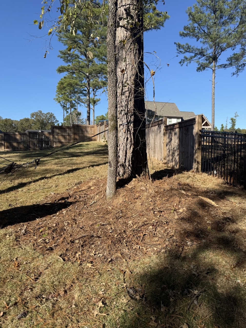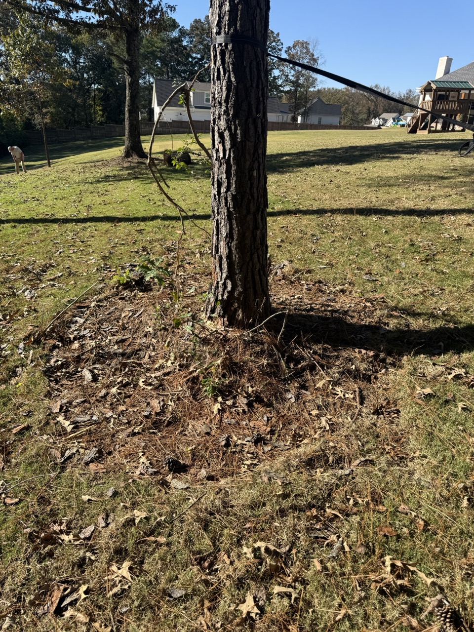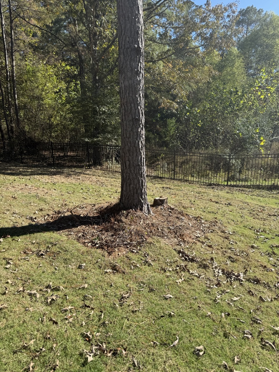 The difference was immediately visible. Before the installation, the space looked bare and unrefined, with exposed roots and uneven ground. Afterward, the pine straw beds added a rich, warm color that highlighted the trees and created a professional, landscaped appearance. The entire yard now looks cleaner, more polished, and more inviting. A small change made a big impact on the property’s overall presentation.